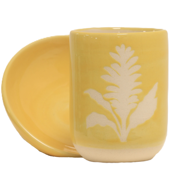 A exuberância da conteira (Hedychium gardnerianum), uma das plantas mais emblemáticas dos Açores, serve de inspiração a este conjunto artesanal de copo e prato de cerâmica.