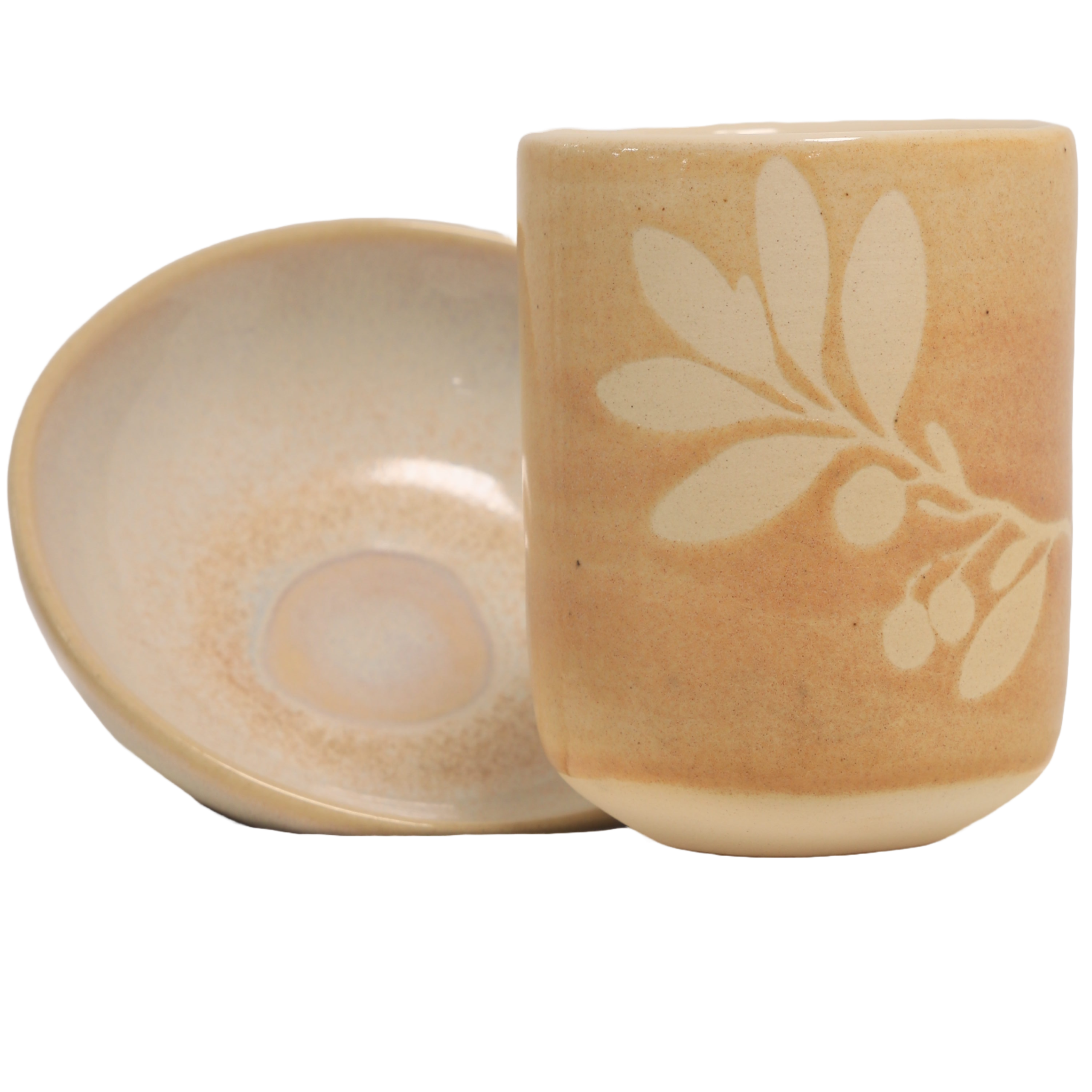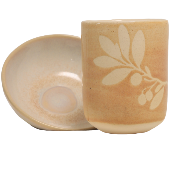 Com a sua fragrância doce e envolvente, o incenso (Pittosporum undulatum) inspira este conjunto artesanal de copo e prato de cerâmica, uma homenagem à natureza exuberante e aromática dos Açores.
